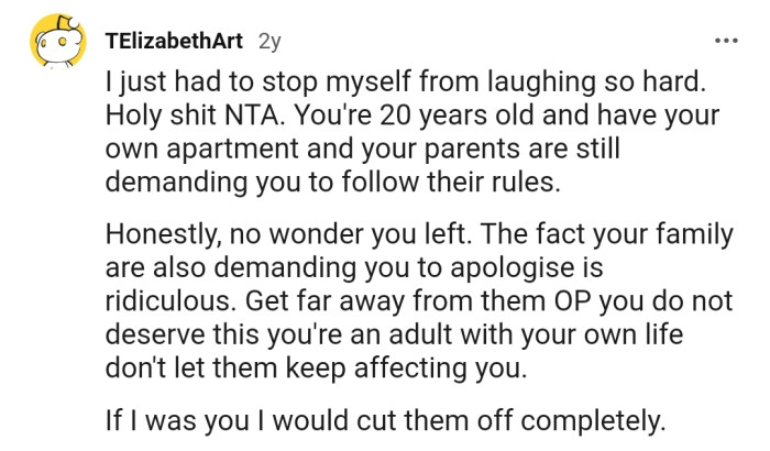 "Honestly, no wonder you left. The fact that your family is also demanding you apologize is ridiculous."