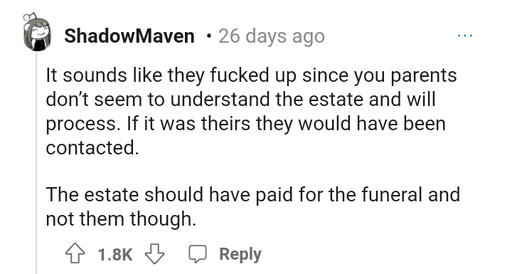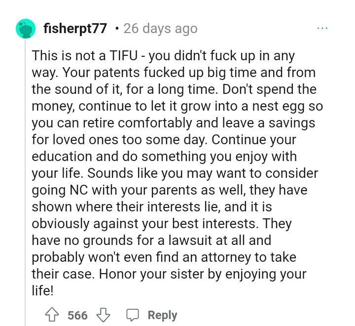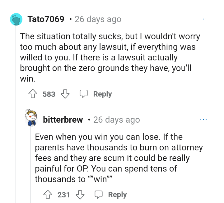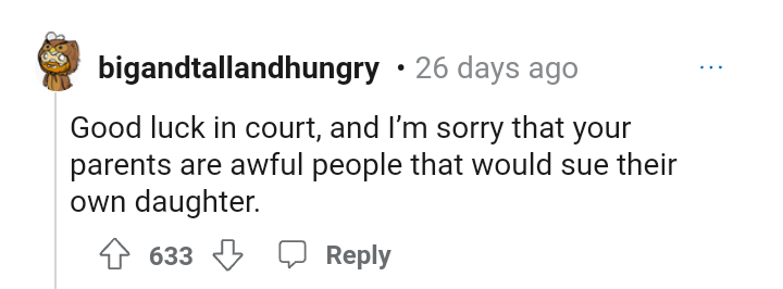 "I’m sorry that your parents are awful people who would sue their own daughter."