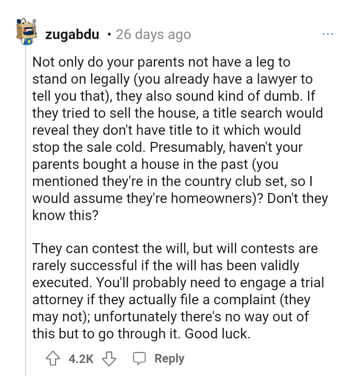 The attorney finally explained the will to Mom and Dad; now they're threatening to sue
