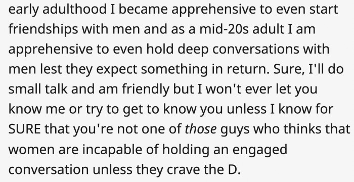 Women have years of experience dealing with this type of annoyance, and we've learned how to "behave" around men. Otherwise, any polite conversation or genuine attempt at a friendly exchange can be misconstrued as leading men on.