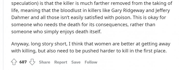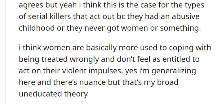 Returning to the Reddit post, many women there presented valid theories and points regarding why there are rarely female serial killers compared to men. It's actually a simple yet mind-boggling notion to consider that there are indeed fewer female killers in history because, let's face it, women also have good reasons to become serial killers just as much as men.