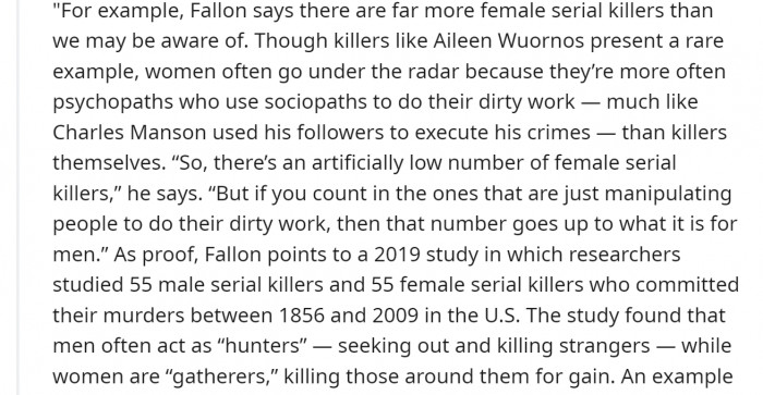 Women don't just get the same attention as male serial killers. Additionally, they only kill people they know, compared to male killers who kill randomly.