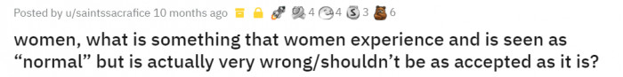 To shed light on that, Reddit user saintssacrifice asked the community the question, “Women, what is something that women experience and is seen as ‘normal’ but is actually very wrong/shouldn’t be as accepted as it is?” The answers were on point.