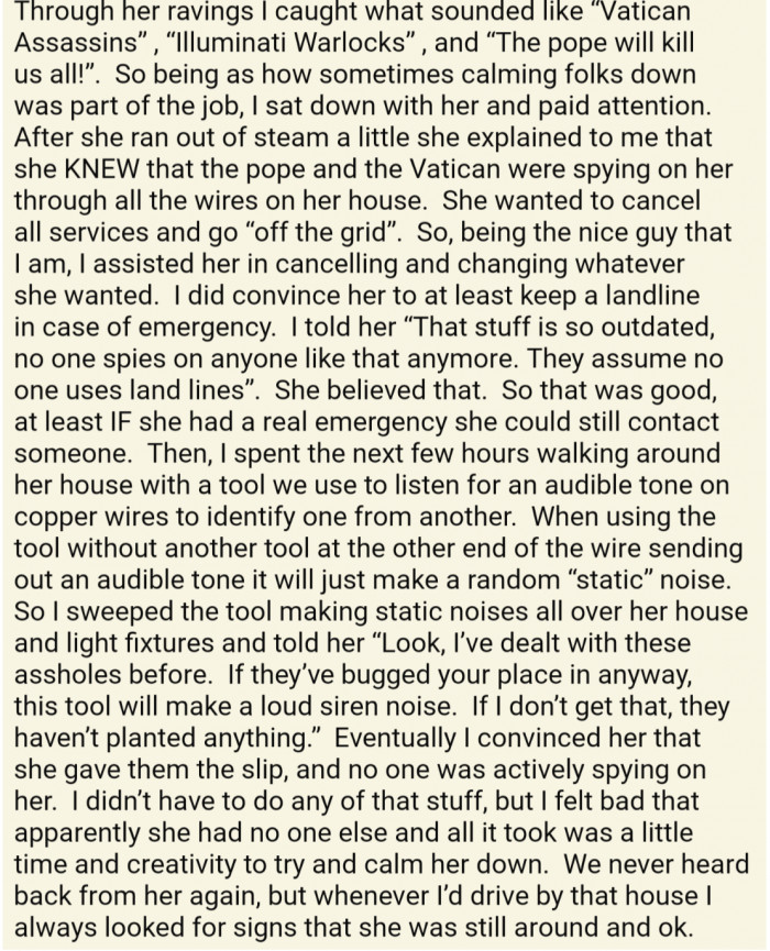 5. Telephone line installer/repairman was sent on a repair and ended up working with an elderly woman in mental distress