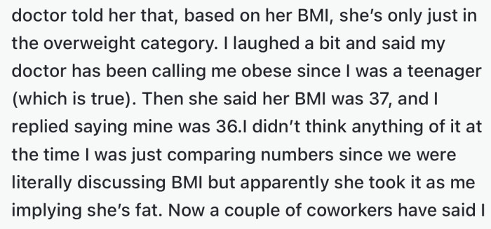 Someone in the office chat decided to turn a weight conversation into a numbers game, and now the coworker is claiming she got “fat-shamed” at work. It’s the kind of workplace drama that starts with a casual joke and ends with everyone side-eyeing each other in the break room. The coworker mentioned her BMI was 37, and when OP shared hers as 36, the situation spiraled anyway. The mess is that BMI talk might feel straightforward to one person, but to the other person it can land like a personal attack, especially in a setting where you are supposed to keep things professional.