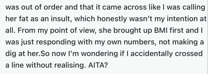 “NTA just as you said, she stated that her bmi is 37 so you continued the conversation by replying that yours is 36.”