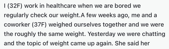 “NTA but it’s weird for her to be comparing weight if she doesn’t feel comfortable talking about both of your experiences.”