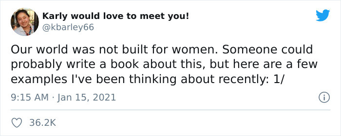 Yet, Karly Hou, a sophomore at Harvard studying computer science, economics, and math, has posted an enlightening Twitter thread that has revealed some insight into the current status of gender bias, which, much of the time, isn't really so obvious. Karly made a strong statement, saying, "Our world was not built for women."