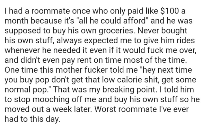 Apparently, the OP once had a roommate who only paid about $100 a month because it was "all he could afford." The OP also mentioned that he was supposed to buy his own groceries but never did.